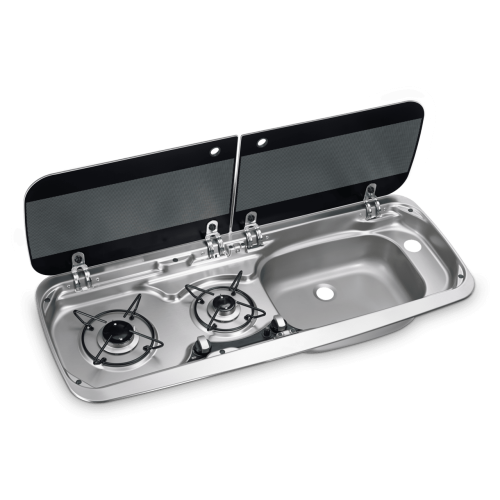 Dometic SMEV MO9222R caravan and motorhome 2 burner hob and right hand sink. Narrow combination with 2 x black glass lid has a piezo ignition system.